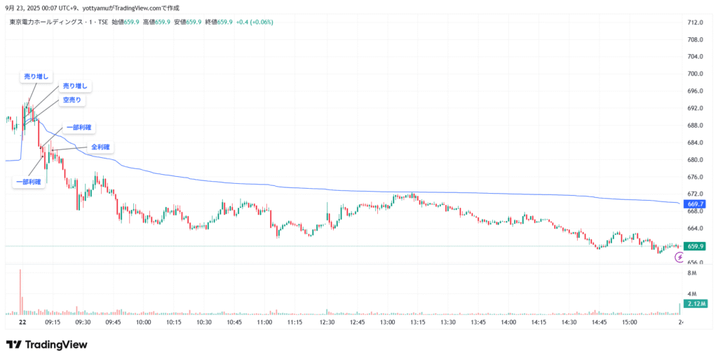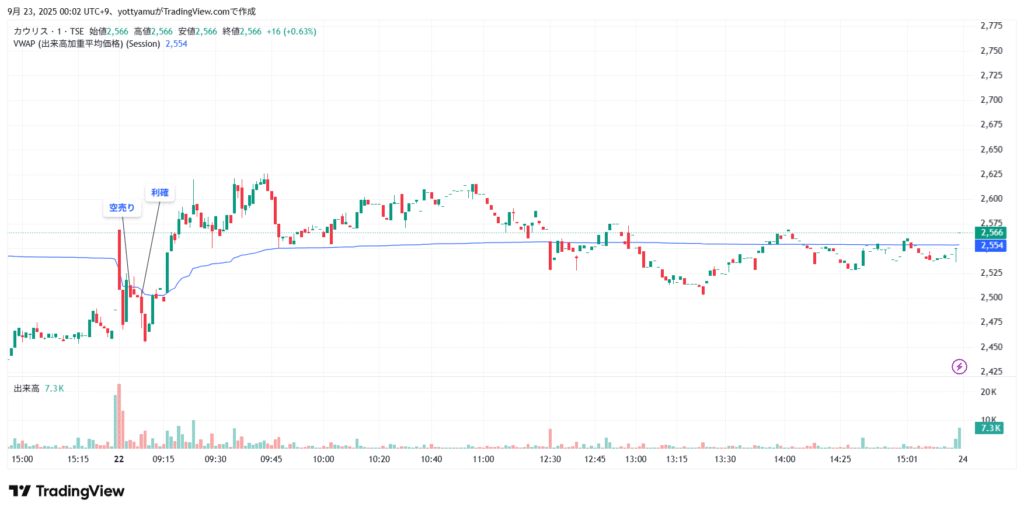 まだ引っ張れると思いつつ、反発にビビッて前日VWAPあたりで利確しました。