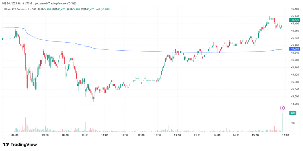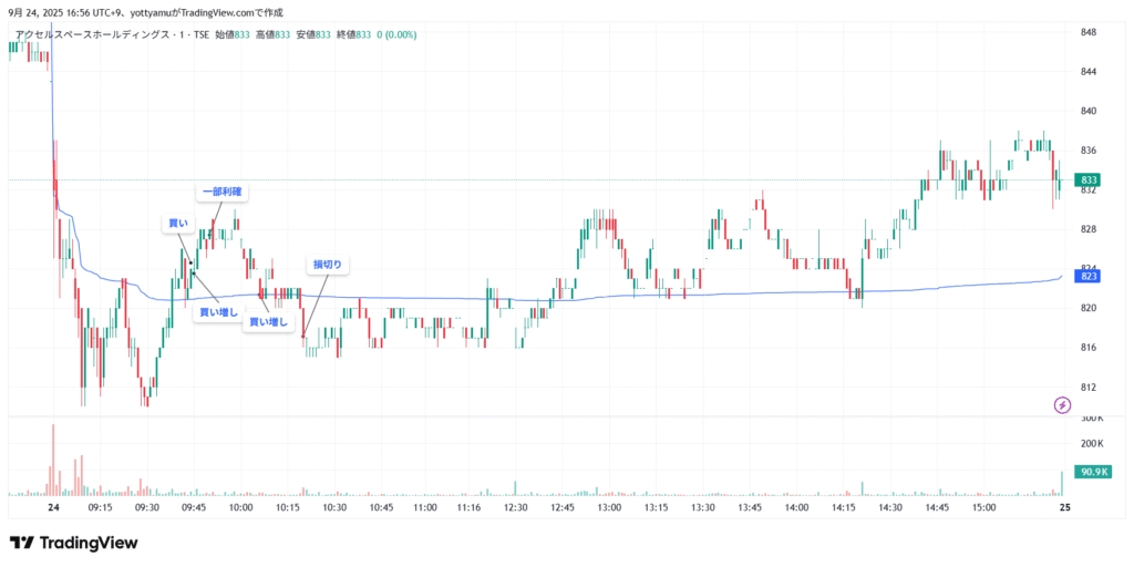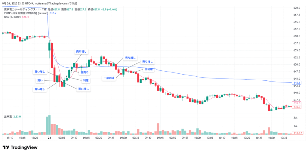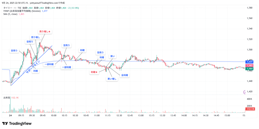 ザックリとした流れは序盤上昇の動きを見て、5日線に抑えられて前日VWAPあたりまで下げることをイメージしてました。
